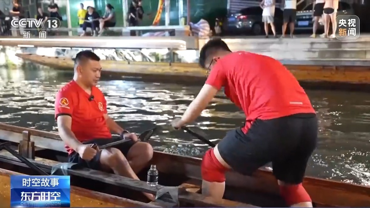 老舵手在船頭、船尾關鍵的位置把住方向,年輕人在船中位置一邊出力,一邊抬頭觀摩——這項最早可以追溯到明代的龍舟傳統,就這樣在一條船上,在一次次夜訓里,又完成了一代傳承。